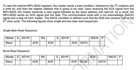 (1)MPU6050的读时序中,结束位产生之前需要产生一个NACK位,也就是将SCL拉高,翻了几遍手册,还是摸不着头脑该怎样产生这个NACK位,所以特来求助一下大家。