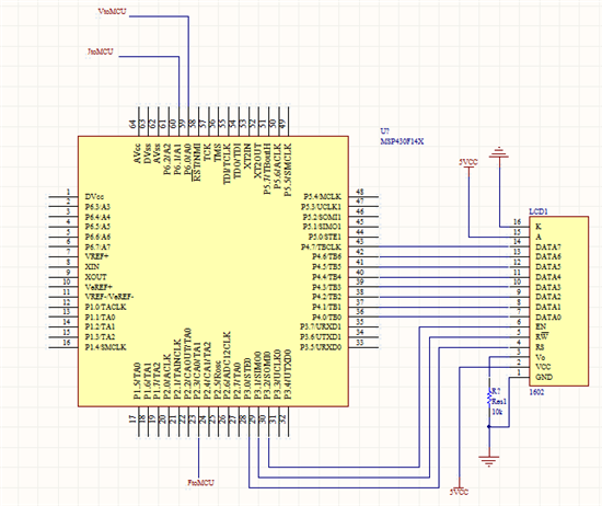 MSP430采用的最小系统板,输入信号与连接LCD的部分电路如图所示: