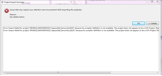 Error: Import failed for project 'DRV832X_MSP430F5529_Trapezoidal_Sensored_BLDC' because its compiler definition is not available. The project does not appear to be a CCS Project. Please try importing it using the 'General > Existing Projects into Workspace' wizard.