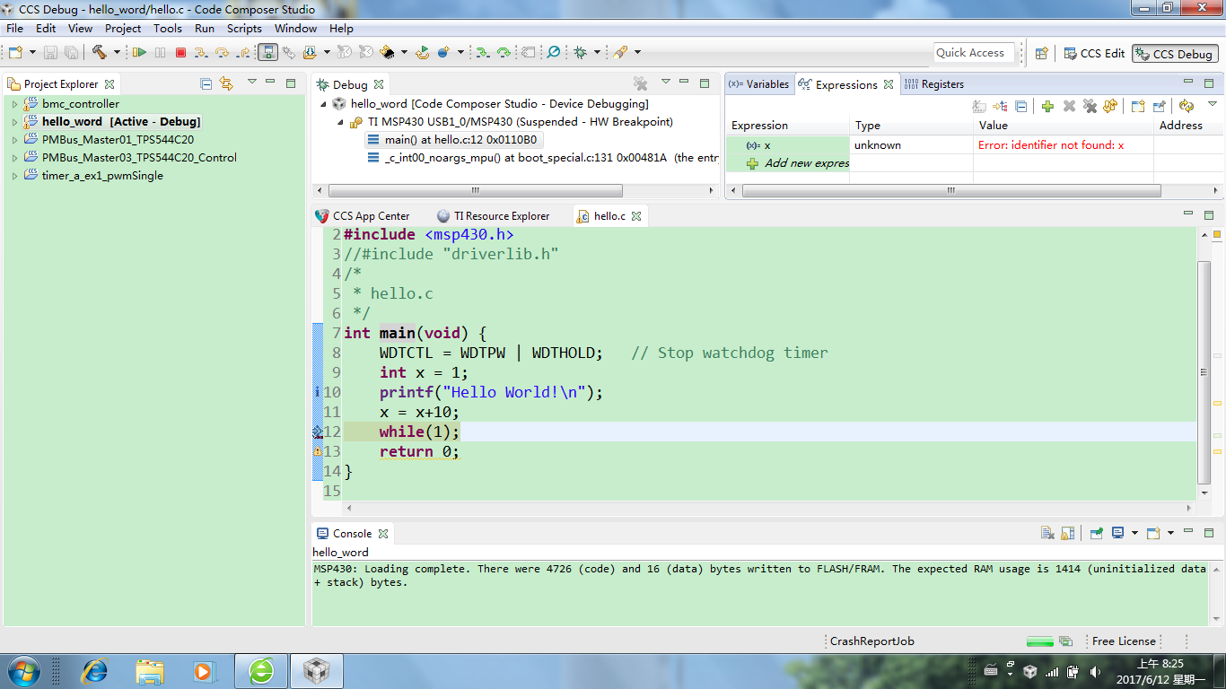 自己做的一个开发板,msp430fr6989 通过MSP-FET430UIF仿真器连接,使用CCS6.1.2 。新建helloword工程后可以正常下载,但是打印不出结果,然后自定义一个加法运算也不能算出结果,这是怎么回事?