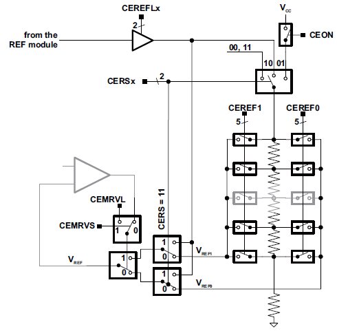 CECTL2 = CEREF13 | CERS_1 | CERSEL | CEREF04 | CEREF03; // VRef is applied to -terminal