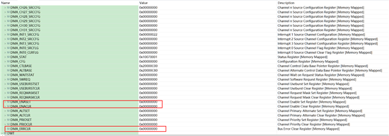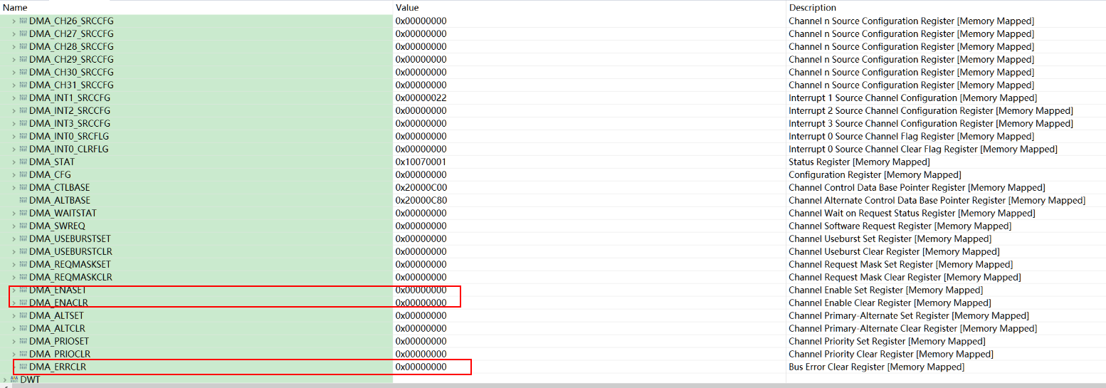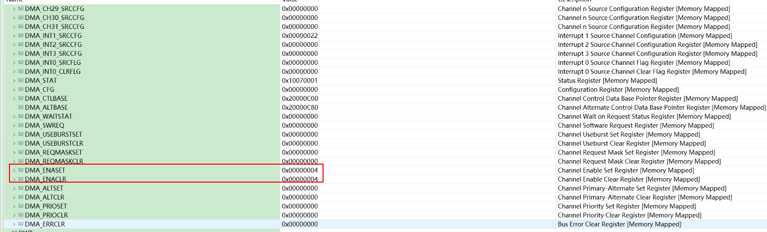 查了下卡住的时候DMA寄存器的值,是图1,里面有2个地方和正常的时候不一样(图2),看了半天没看懂。。