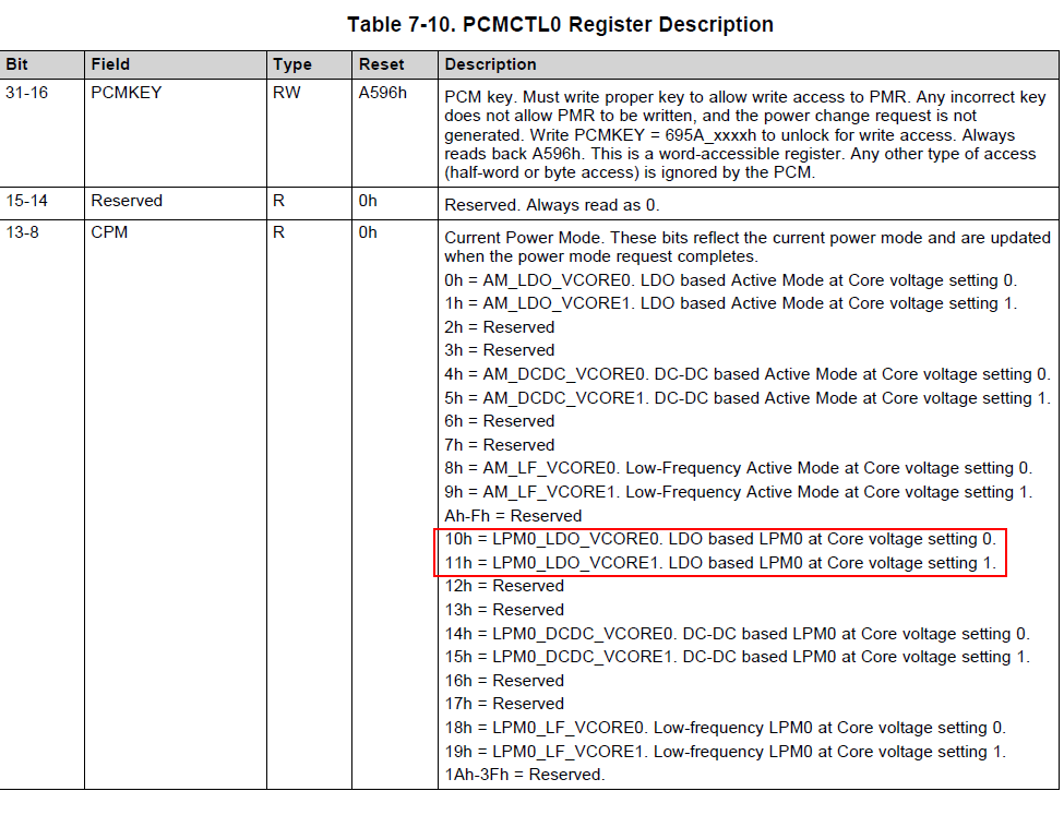 这个图是前面7.9节的,发帖那个地方是7.24寄存器那节的。这两节有点不一样,在7.24那节里面写的10h,11h,14h,15h,18h,19h首位的1对应LPM0,但是7.9节这个地方写的LPMR是×,应该意思就是这一位不用管,有点矛盾。如果按照这一位不管的逻辑,那就能解释为什么那个地方一直是0了。