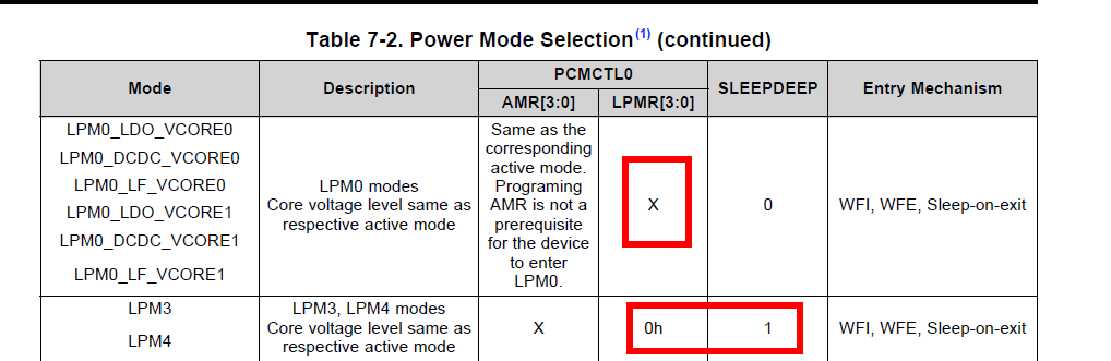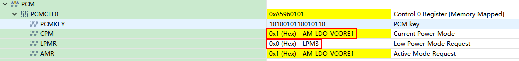 用官方的power_change例程,想试试深度睡眠模式。在前面几个AM_LDO,AM_DCDC都挺好的,没什么问题。但是从LPM0开始就有点问题了,主程序是进了gotoLPM0()(因为我暂停的时候,是停在CPU_wfi()这个函数里的),但是寄存器PCMCTL0里始终是AM_DCDC,LDO,LF在循环,没有出现LPM_DCDC,LDO,LF的情况,如图1。
