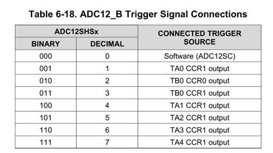 ADC12CTL1 = ADC12SHP |ADC12SHS_2 | ADC12CONSEQ_1 ; // TTimer_B TB0 CCR0 output触发采样,序列通道采样 0-1