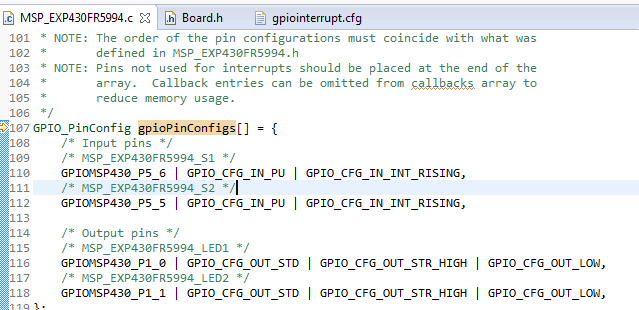 TI-RTOS示例程序 gpiointerrupt_MSP_EXP430FR5994_TI 主函数中 GPIO_write(Board_LED0, Board_LED_ON) 函数是让P1.0输出高电平,但是Board_LED0 是怎么映射到P1.0的? 追踪其定义可以知道其映射到了下面这个结构体中的 MSP_EXP430FR5994_LED1