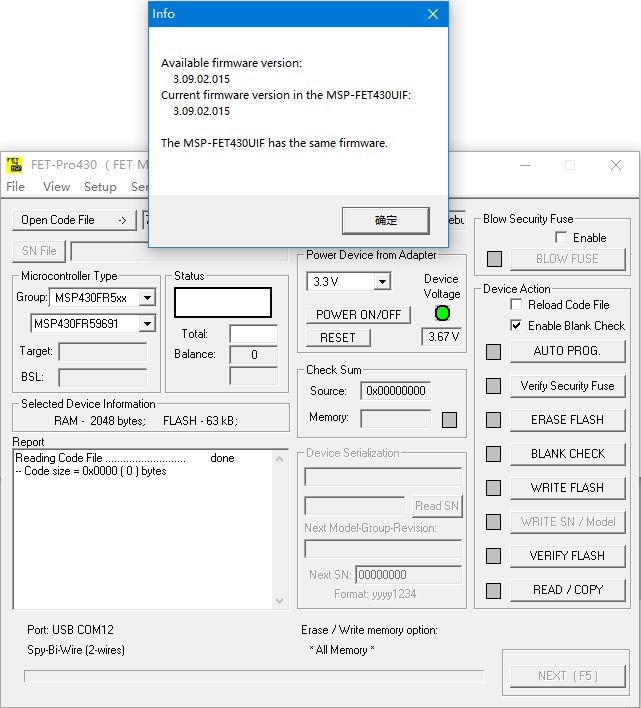 在设备管理器上可以看到相关信息和FET-Pro430 Elprotronic上可以读到fet的信息.用JTAG也能正常读取,所以判定不是FET的问题。