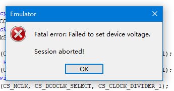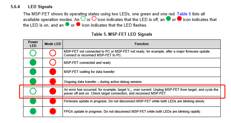 从FET手册看到这个LED灯代表的意思,“An error has occurred; for example, target VCC over current. Unplug MSP-FET from target, and cycle the power off and on. Check target connection, and reconnect MSP-FET.”然后检查引脚之间的电压,我之前代码中有把某个引脚电平拉高,但是监测不到电压被拉高了。所以最后判断可能是芯片出问题了,然后换了芯片,终于解决了。