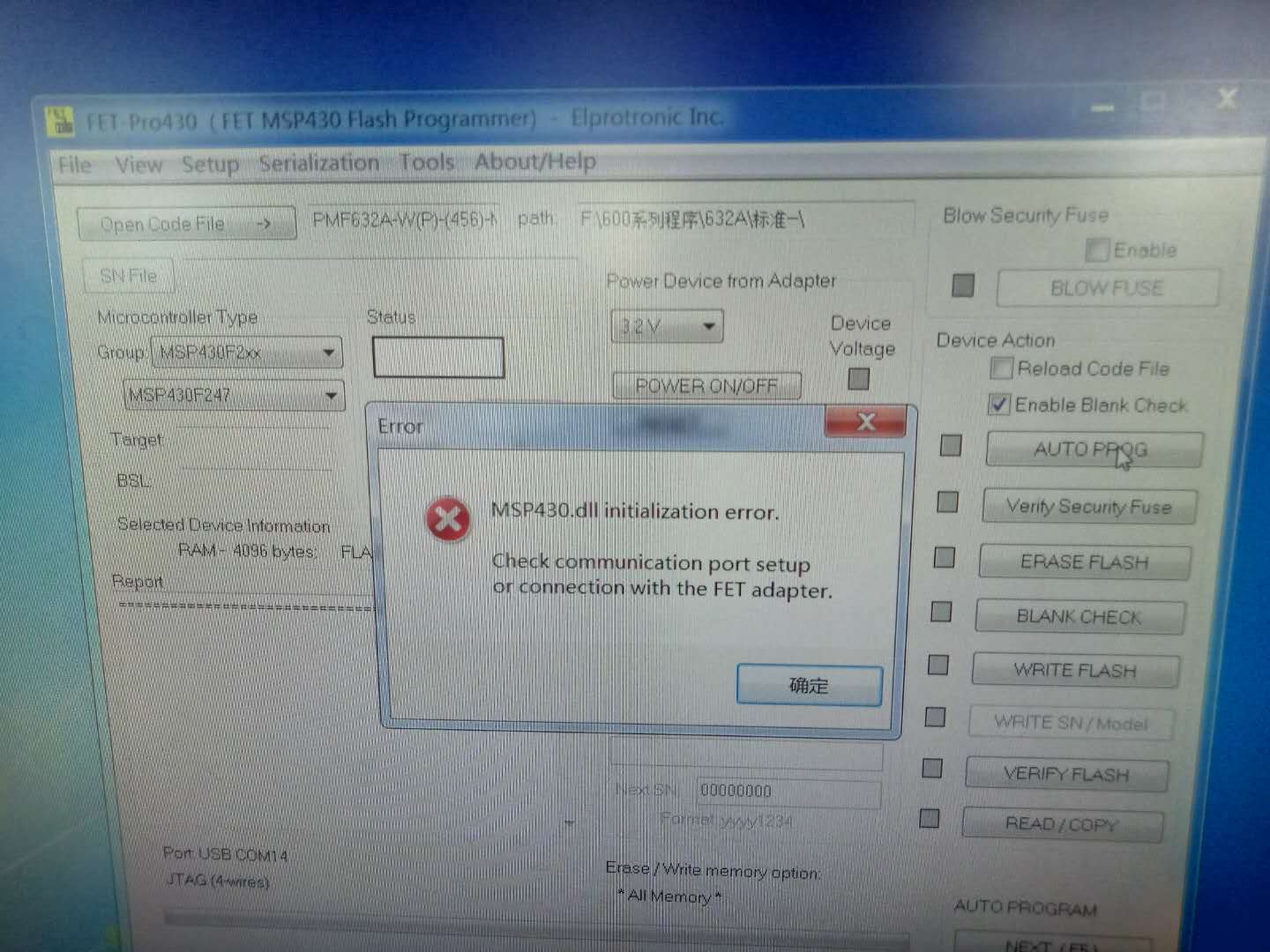 在使用MSP-FETU430UIF仿真器下载程序时出现如下图提示错误,MSP430.DLL初始化错误。所用430型号是F247,该怎样处理?因为不是第一次使用,所以驱动安装成功的,