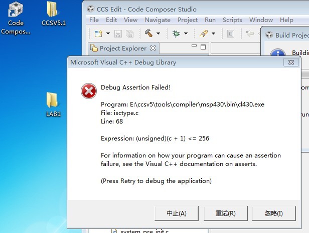 我在用CCS编译一个自带的MSP4305529的例程时反复出现Debug assertion failed对话框,里面有中止,重试,忽略,选哪个都无法完成编译,最后显示结果为Target `all' not remade because of errors.