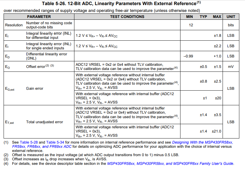 我想确认下MSP430FR6972的ADC采样精度,比如说我基准源2V,实际采集1V的电压,ADC采集的实际偏差会是多少?应该怎么计算?
