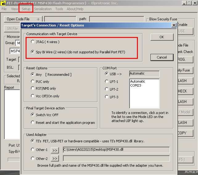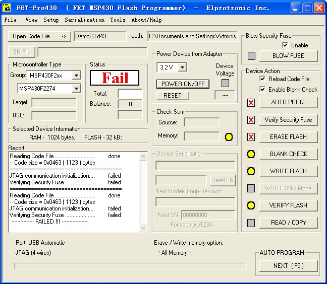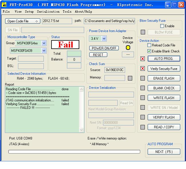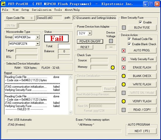 我新买的msp-fet430uif,TI原厂的,我用来烧写msp430FG439单片机,驱动都是安装好了的,我第一次用430uif,用的Lite FET-Pro430 Elprotronic烧写程序,却提示jtag初始化报错,如下图,好像3.4V电也没有加上,请大家帮帮忙,我的电话:13548052934,邮箱:13548052934@163.com,非常感谢