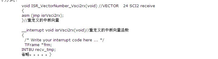 1.如何重定义和映射中断向量?下面是我们以前用的芯片的一个方法,ISR_VectorNumber_Vsci2rx是默认的中断向量,isrVsci2rx是重定义和映射的中断向量,有多少个中断向量我们就写多少个重定义映射函数,把所有的重定义映射函数固定在FLASH的某个位置,__interrupt void isrVsci2rx(void)写在应用程序里,这样进中断以后中断向量默认指向重定义的中断向量isrVsci2rx,然后再执行相关的中断函数,这样芯片升级以后我们还把重定义的中断向量写在以前固定的FLASH位置,每个重定义中断函数只占2个字节,我想问下在TI的芯片上如何实现这种方式?
