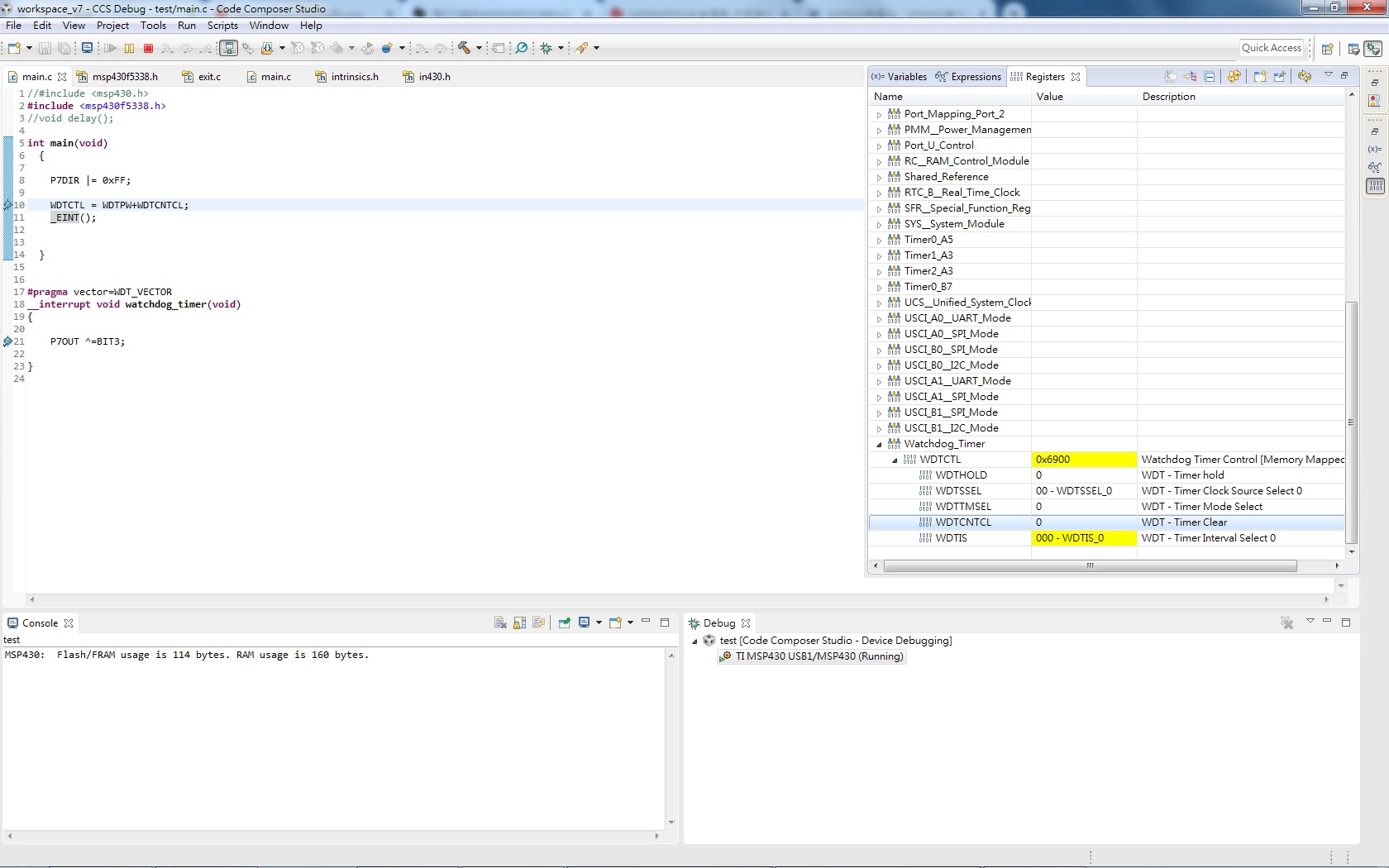 程式如下,其中WDTCNTCL預設定Watchdog timer counter clear,bit3應該為1, 但在debug的Registers顯示bit3始終為0 (下圖右下角顯示)