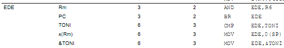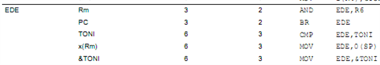 在表4-19中也列出了MOV和CMP不同,MOV,BRA 在立即数到寄存器寻址只用2个周期,CMP, ADD, SUB等要3个周期,