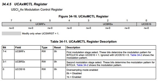 UCA0MCTL 寄存器的最低位OCOS16为0用来指示采用低频的32K作为时钟源。高4-7位UCBRFx用来对高频的晶体模式下的BRCLK调节,1-3位UCBRSx用来对低频模式下的BRCLK调节。在本案中:UCA0MCTL = 0X4A,OCOS16为0,高4位可以忽略,UCBRSX=5;