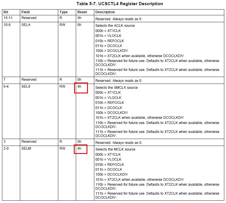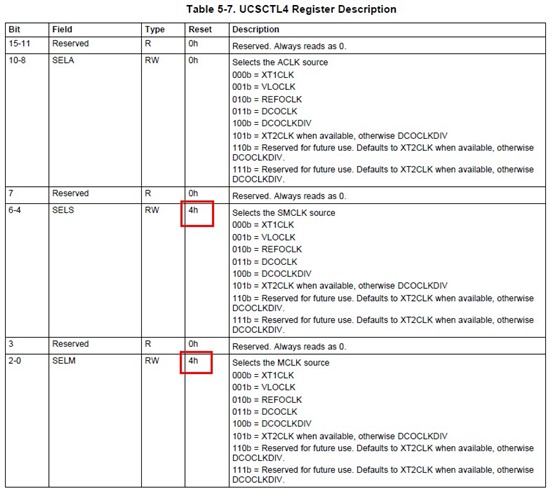 UCSCTL4&=(UCSCTL4&(~(SELA_7|SELM_7)))|SELS_0|SELM__XT1CLK|SELA_0;//将ACLK和MCLK时钟源配置为XT1