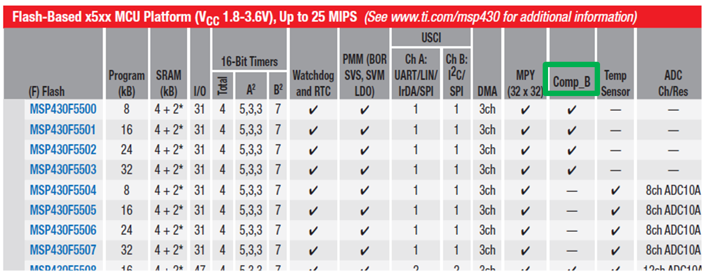 我刚开始接触MSP430,我要选的是具有两个Comparators的微处理器。我在产品列表里找,发现如下问题: