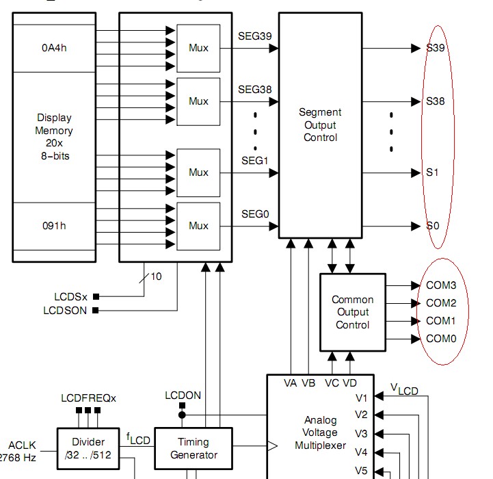 另外6系列的芯片根据不同的管脚数量提供了160-320不等的驱动力 不过有个问题就是在4个COM的情况下430只能带160段(我自己这么认为的)。
