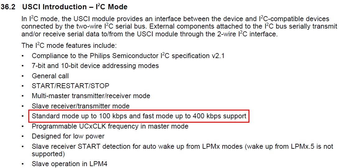 请教一下,MSP430F5526 I2C的SCL 最高频率能到达多高?好像datasheet里面没有给出相关的数据