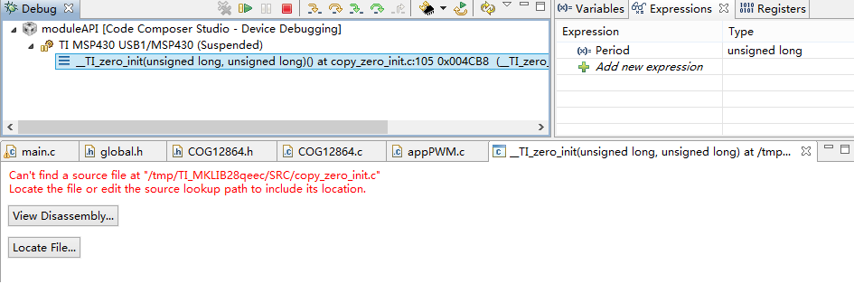 接着,我点击了暂停按钮,想看看程序停在了哪里,CCS给出了这样的警告: