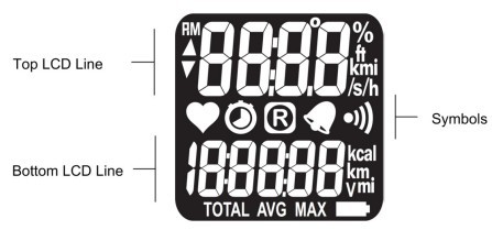 按下 "#" 直到 "kcal" 图标出现。 如果使用了可选胸带并且心率模式被激活,这个模式可显示运动时消耗的热量。 如果使用了带有内置加速计的胸带,这个模式还提供距离(例如,跑步时的距离)。为了确定热量的准确值,用户需要设置他们的性别和体重。按下 "DOWN" 来激活另外一个显示。 要返回热量模式,再次按下 "DOWN" 按钮即可。