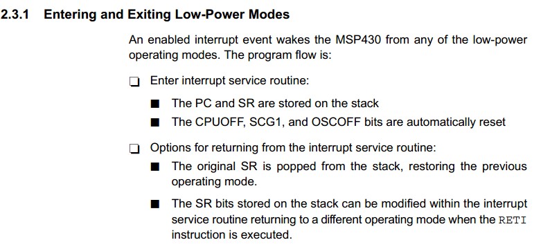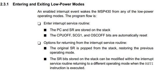 2.在LPM状态下,进入中断后没有reset SCG0。如果我MCLK用的是DCOCLK会发生什么? 会出现程序跑不动吗。