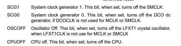 SCG0 系统时钟产生0.当这一位被置位时,如果DCOCLK没有被用作MCLKorSMCLK 就会关闭DCO dc gennerator.