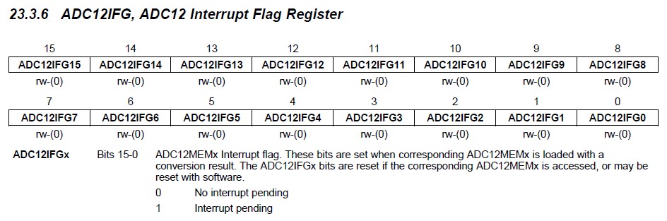 •  你好,ADC12IFG 是 ADC12模块中的一个中断标志位寄存器,描述可以在users guide中找到,如下,
