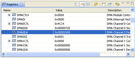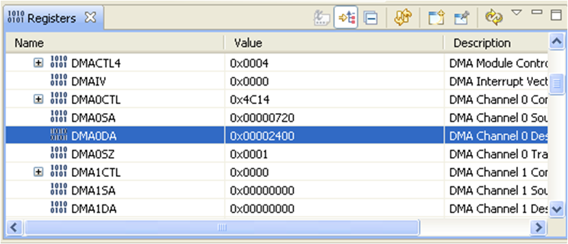 • 1.单步运行后通过registers窗口观察DMA0DA地址的变化,如图:始终都是002400h