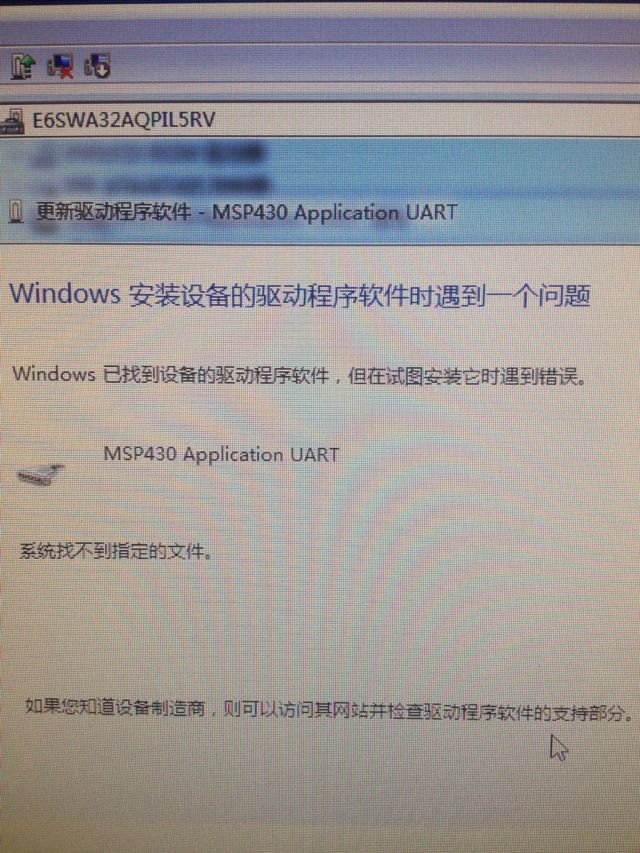 在win7的操作系统上,我第一次使用msp430g2552 lauchpad UART驱动安装不成功,手动安装时出现类似如下画面,重新卸载该设备再接入也还是不行,求问如何解决,谢谢