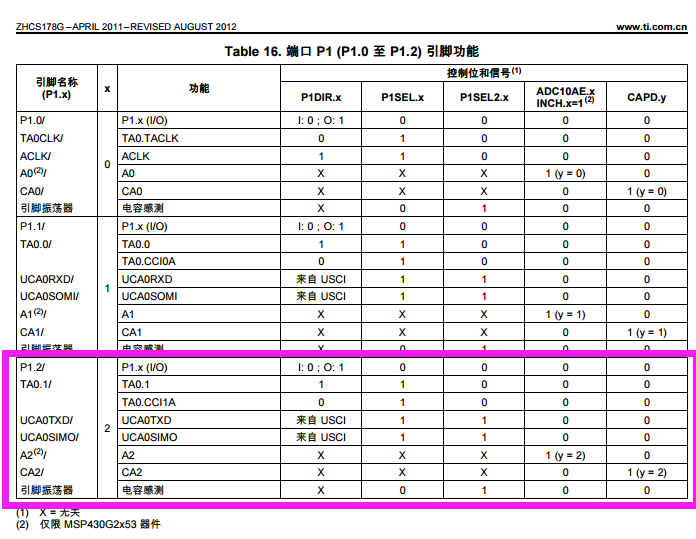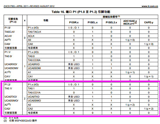 这个图上说的第一外设模块功能和第二外设模块功能分别是指什么?例如对于管脚P1.2来说,它有P1.2/TA0.1/UCA0TXD/UCA0SIMO/A2/CA2这么多功能,我怎么根据自己要用的功能来配置P1SEL和P1SEL2这两个寄存器呢?到网上查找了很多资料,都没找到对每个IO管脚功能的详细配置说明!