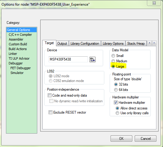 上面是IAR中的操作,IAR 开发环境中,右键点项目名称进入Options for node "xxx", 在General Options的Target页面的Data Model选项中 选择Large模式.