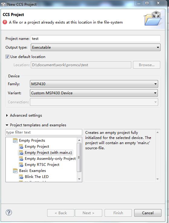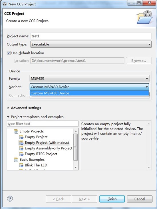 你使用的CCS是哪个版本的?你已经选择了msp430,variant栏可以选择相应的料号所在的family。另外楼主截图中有错误警告,建议将新建的工程放在一个新的路径下面。