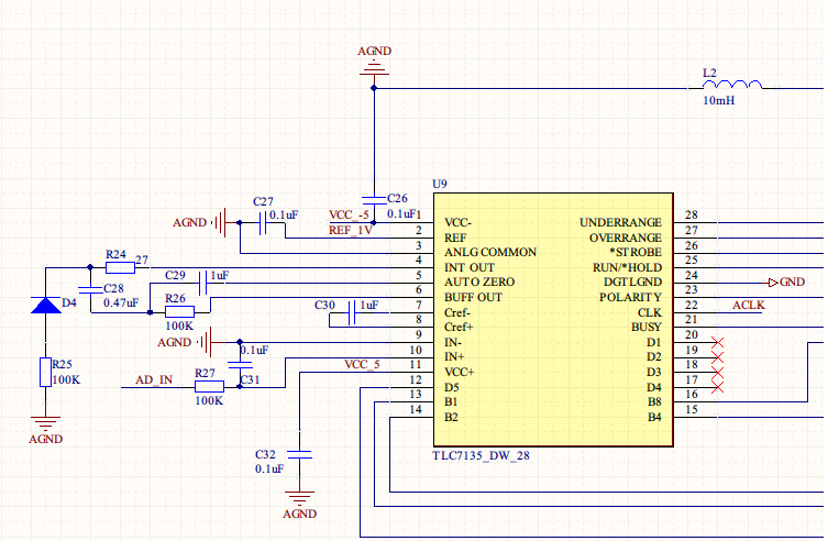 其次,如果STROBE引脚是输入,那么就是可以通过430的I/O口控制TLC7135,但是STROBE具体能控制什么呢?D5~D1各位选通依次相差200个周期,而这是恒定的,有没有STROBE的负脉冲信号对输出都没有影响,我在编写430采集TLC7135转换数据的程序时候比较对这一点感到很困惑。
