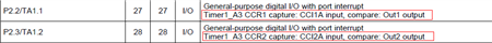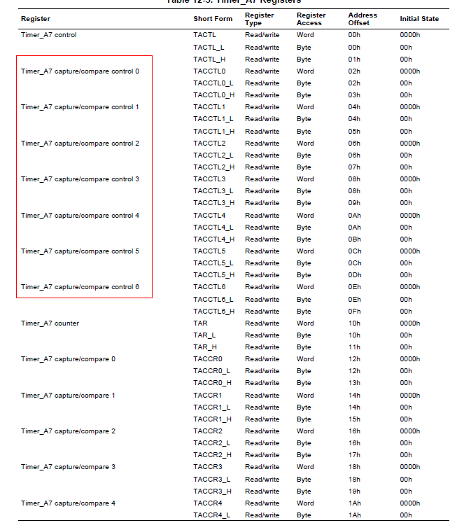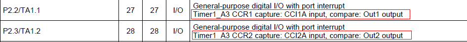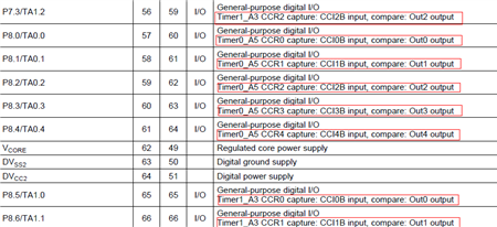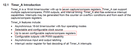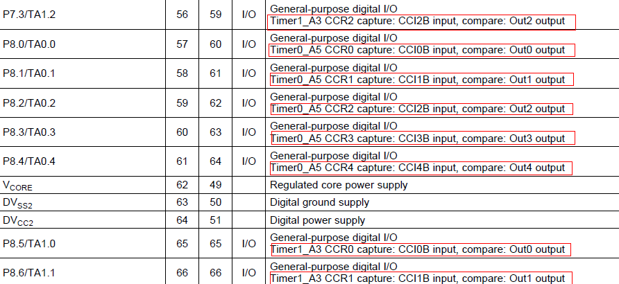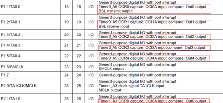 首先,从这个引脚表中红色标记部分可以看出这个芯片的timer部分分为timer0,timer1,然后有个疑惑就是timer后面跟的那个A1,A2...这是什么意思?假如我要用到taccr3输出pwm波我该从哪个引脚输出啊?(因为user's guide中说了他有7个比较捕获模块,所以理论上来说他还有taccr7的,这些都从哪个引脚输出啊?还是说我本身理解就有问题,输出pwm波是利用他的比较模块这是对的呀,到底怎么回事啊?求解释啊!!!)接下来,我看了用户手册上的一些东西截图如下: