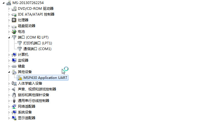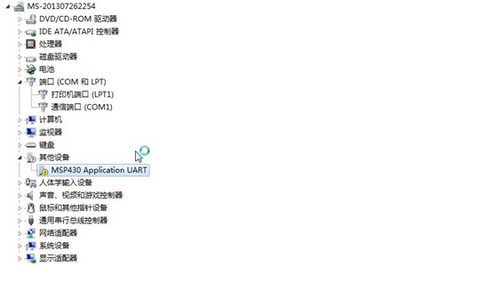 把launchpad编程器实验板插到电脑上之后,在控制面板的设备管理器中“MSP430 Application UART”一直显示叹号,说明launchpad的驱动没有安装好。