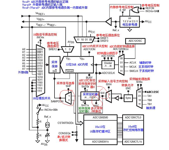 ADC12模块中是由以下部分组成:输入的16路模拟开关(外部8路,内部4)ADC内部电压参考源,ADC12内核,ADC时钟源部分,采集与保持/触发源部分,ADC数据输出部分,ADC控制寄存器等组成。