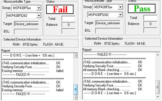 近日我在使用贵司的MSP-FET430UIF,所烧录的MCU型号是MSP430F5242,使用的是Lite FET-Pro430 Elprotronic软件,及V2版本的Firmware。异常表现为Erase fail,但是BlankCheck Pass,不管导入什么image,Verify 都会Pass。请问这是哪里出了问题?
