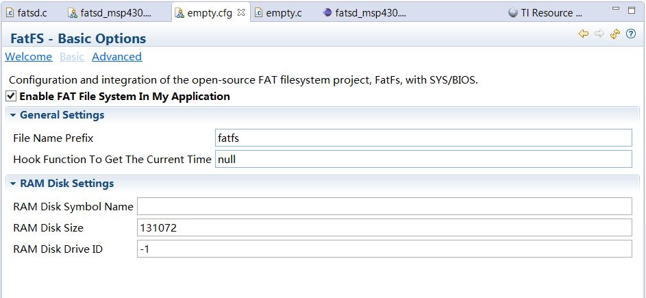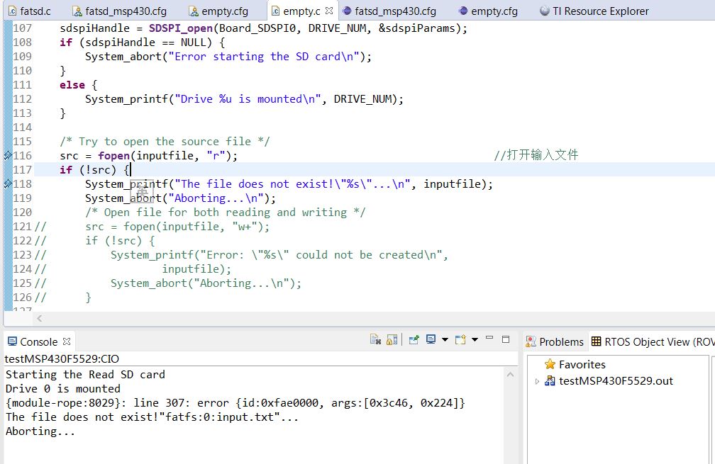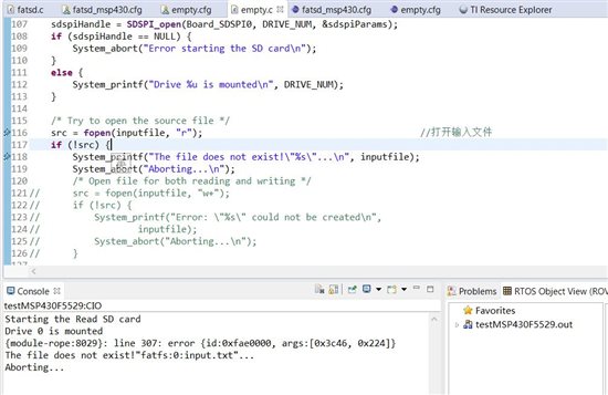 我正在用EXP_MSP430F5529 experiment开发板跑TI-RTOS。开发工具CCS6.0,. 我从TI 资源管理器里找到TF卡测试的TI-RTOS例程,并把它下载到开发板上,可以创建input.txt,并在上面写入字符串,然后也可以创建和读取output.txt里的内容,并在终端上显示内。但是当我自己新建一个CCS工程,加载了同例程一样的SDSPI,Fatfs驱动,在用C语言IO操作流打开文件(fopen)的时候,终端出现了错误提示“{module-rope:8029}: line 307: error {id:0xfae0000, args:[0x3c46, 0x224]}”
