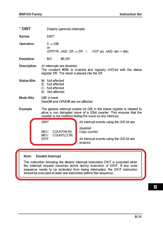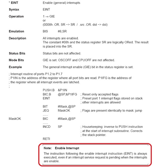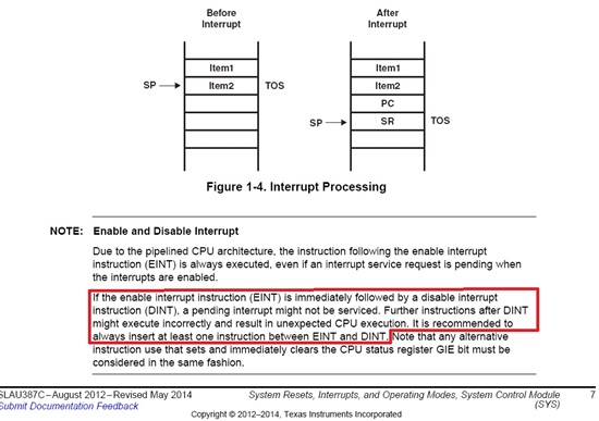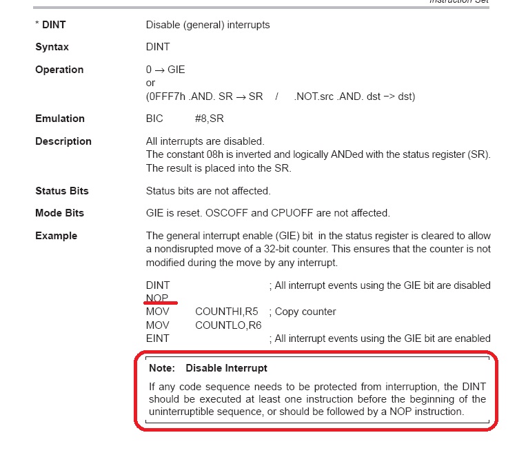 "Now in this case, the instruction following the DINT is already fetched at the moment when GIE is cleared. Now at this point, an interrupt may already have been granted (after fetching the DINT instruction but before executing it), and sicne the following isntruciton was already fetched, it will be exeuted before the already granted interrupt is performed."