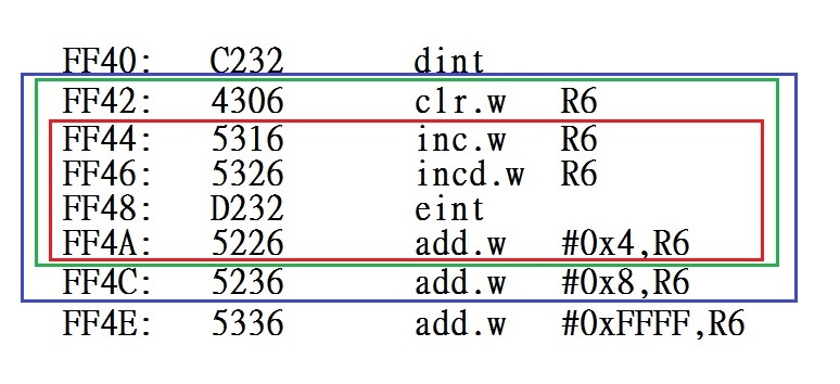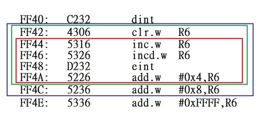 因此, 在下面的指令序列中; DINT 和 指令1 之間可能被中斷. 指令1到指令a之間不可能被中斷. 指令a後可能被中斷.
