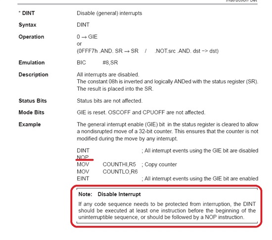 如图所示,红圈中的文字是什么意思,DINT指令后跟随NOP指令的原因是啥。在胡大可的中午书中的例子中并没有NOP。是否DINT执行后的第一条指令仍有被中断的风险。