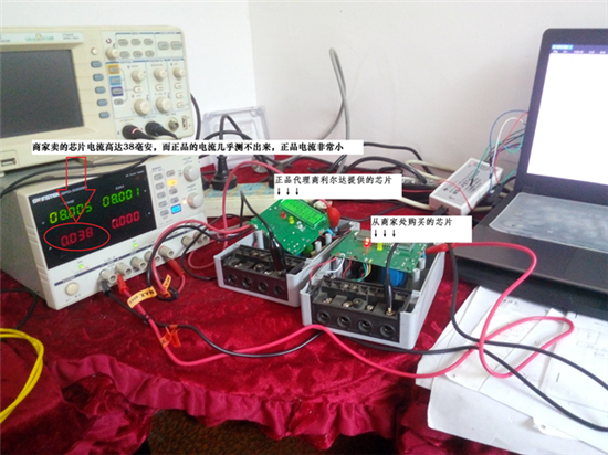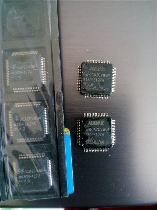 年前在天猫店买得5片MSP430FE427AIPM芯片5片,购回后焊在电路上后,仿真器无法识别,且电源部分电流38mA(直流8V的电源,通过HT7133转成3.3V给MCU供电),从利尔达申请了3片MSP430FE427的芯片,焊上去就能正常工作,因此对比觉得可疑。查看芯片似乎是编带之后又用激光烧了ADDAX SC.4.34两行文字,不清楚该芯片是否是原装正品,或为散新货?请大家帮忙鉴定一下,谢谢!