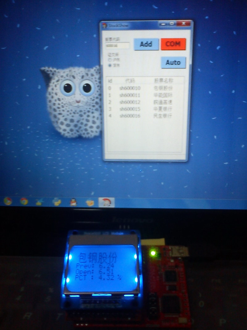 其实工作原理很简单,上位机取得设定好的股票信息,通过串口发送到MSP430中,然后在屏幕上显示出来,不断更新最新数据。