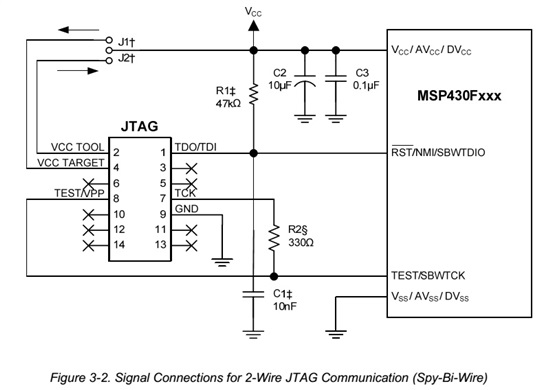 我的MCU用的是MSP430F5252芯片,JTAG方式烧写,匹配电阻是47K,电容式10NF。可以正常烧写程序。但是在进行SBW方式烧写的时候,电阻不变,电容分别换为2.2NF和1NF,烧写器都不能连接成功。4线接法都正确,请帮忙分析原因。