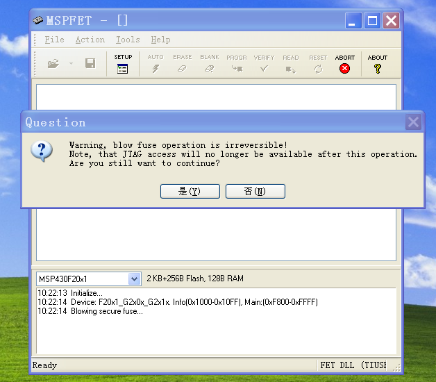 MSP-FET430UIF 在SBW二线连线方式下, 能烧断加密熔丝吗?,器件型号为MSP430F2001/MSP430F2011.