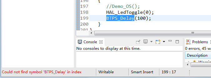 我用MSP430F5529、CC2564模块做实验,用CCS重新建立了工程,而且所有文件都拷过来了,而且没有出错,但是有一个函数却不能打开函数声明,右下角提示“Could not find symbol ‘BTPS_Delay’ in index ”,这是怎么回事?