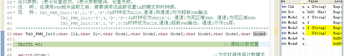 这里有一个函数传入参数多个,为什么我仿真的时候里面的值不是我传入的值,TA0_PWM_Init('a',1,'f','f','f',3,2,'d');    我用的是ccs5.4图为仿真的值