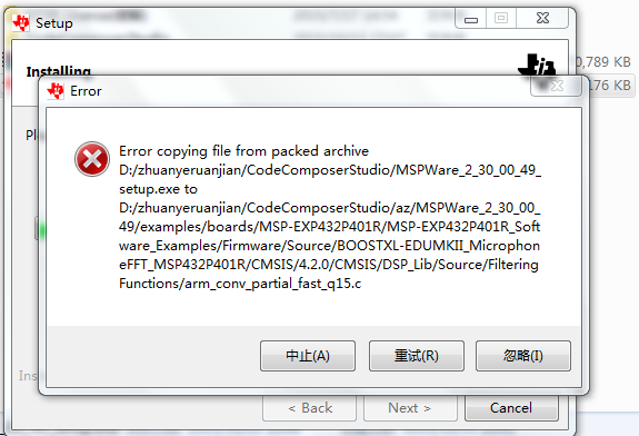 使用的是CCS V6 ,在软件自带的APP 里面装MSPware,网速慢装不了,在TI官网上面下载下来装也出现问题。如图片